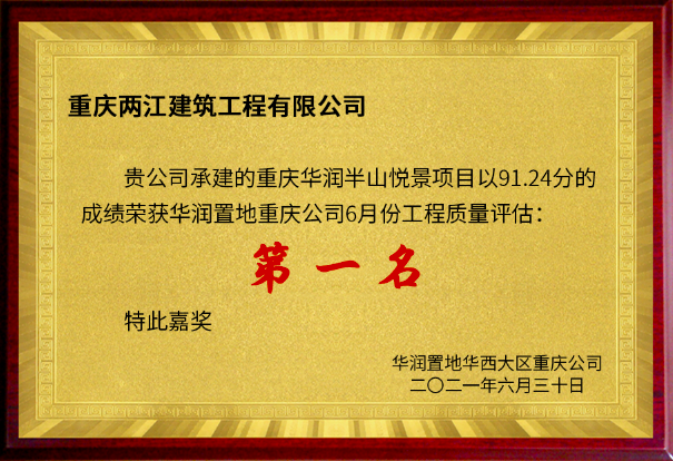 重庆华润半山悦景项目荣获华润置地重庆公司2021年6月份质量评估第一名